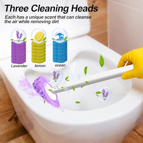 - toilet brush with disposable head: The disposable non – woven sponge heads eliminate issues like water pooling and hair entanglement. They are sturdy, won't scratch the toilet surface, and have a large contact area for thorough cleaning. The ocean, lavender, and lemon scents not only clean but also purify bathroom odors. With 48 heads, it can last you up to 12 months with weekly cleaning