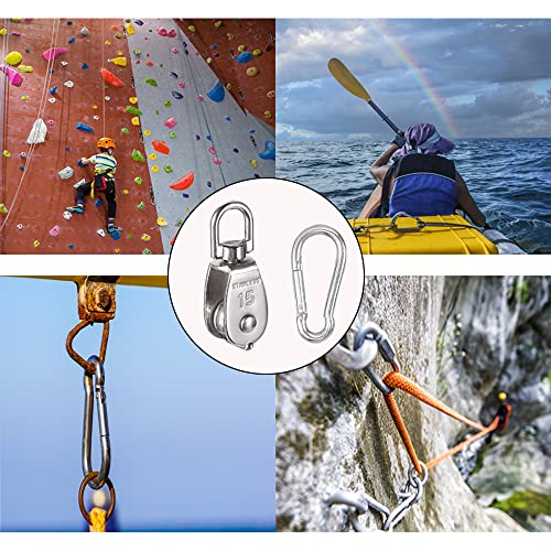 2 Sets 304 Stainless Steel Pulley Block Silver Pulley Roller with M6 Spring Snap Hooks M15 Single Pulleys Wheels for Rope Maximum Loading Capacity 35kg