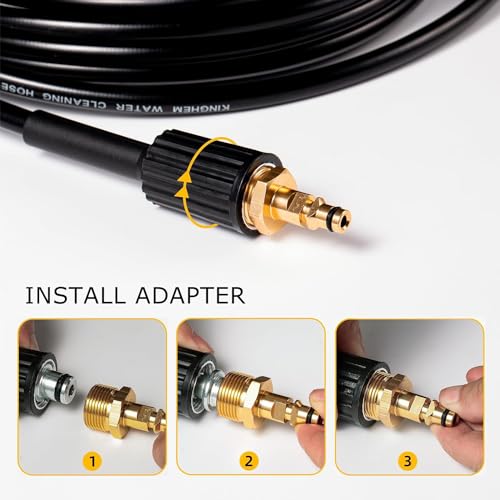 - 【EXTRA C-CLIP TYPE FITTING QUICK CONNECTOR MAKE CONNECTION MORE EASIER AND QUICKER】 – One side of this high pressure hose is a professional Karcher-style with brass screw thread M22 coupling, it could immediate connect to the pressure washer. And the other side is Karcher-style bayonet click coupling, it allows you to quickly click into the trigger gun and release the hose by pressing the yellow button on the trigger gun.