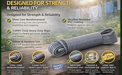 - 🧺☀️ EXTRA STRONG STEEL CORE: Engineered with a robust 25-meter steel core, this washing line is designed to handle heavy laundry loads without snapping or sagging. Perfect for large families and heavy items like wet bedding, towels, and jeans.