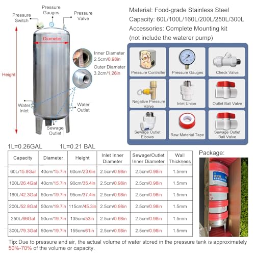304 Stainless Steel Garden Pressure Tank, Automatic Pressurized Water Tanks for Home Bathroom Washing Machines, 80 60 50 40 20 16 Gallon Domestic Water Storage Containers(79.3Gal/300L)