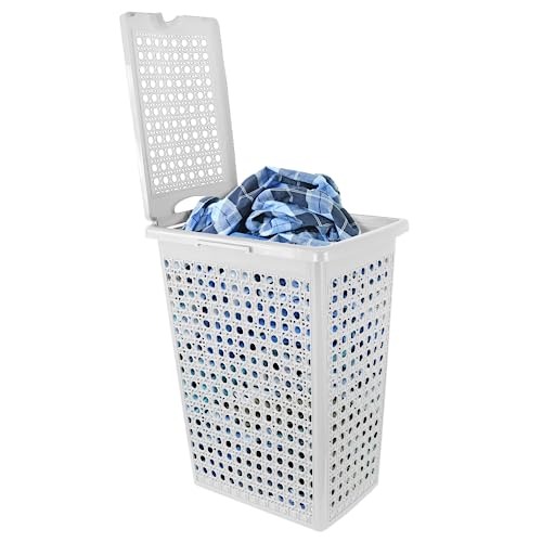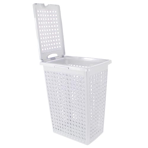 48L Plastic Slimline Bathroom Washing Basket Laundry Linen Hamper Storage Clothes Bin Hinged Lid Rattan Style (White)