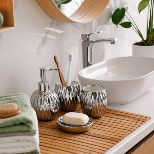 4PCS Bathroom Accessories Sets, Ceramic Bathroom Organizer, Soap/Lotion Dispenser, Toothbrush Cup, Bathroom Counter Soap Set for Home Hotel Bathroom Countertop (Silver)