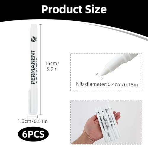 6Pcs White Marker, 1mm White Permanent Marker Pens Waterproof Quick Dry Fabric Paint Pen Acrylic Water Based Ink Pen for Rock Metal Glass Wood Fabri Tyre Painting