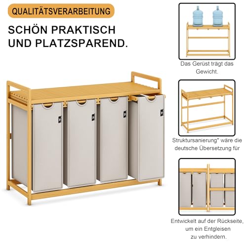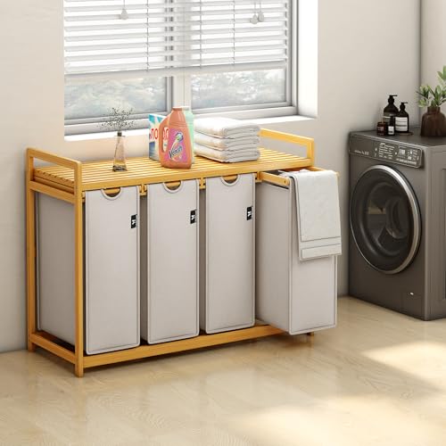 - [Four Compartment Laundry Basket]: 4 Storage Bags (4X50L/Bag), More Convenient To Pre-Sort Clothes,The shelf can be used for decorations, and bathroom supplies, towels, or detergents can also be placed on the shelf. This multifunctional collector provides enough space to keep your items tidy and versatile.