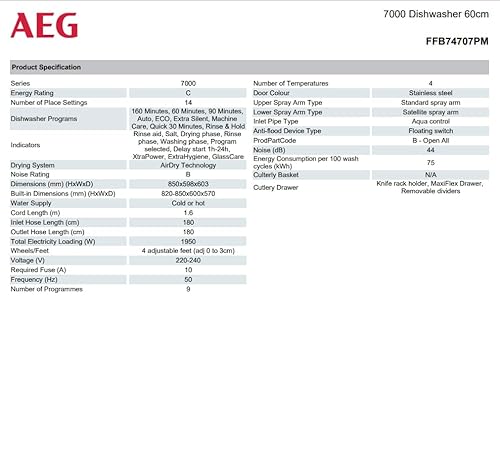 Be the first to review “AEG 7000 Series Freestanding Dishwasher FFB74707PM, 60cm, 14 Place Settings, AirDry Technology, MaxiFlex Drawer, Delay Start, GlassCare SatelliteClean, dB44, 850x598x603mm, Stainless Steel, Class C”