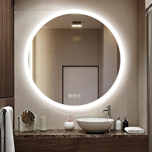 AI-LIGHTING 60cm Bathroom Round Mirror with LED Lights Circular Illuminated Anti-Fog Backlit Light Up Circle Mirror Touch Switch Color Change Demister IP44 Dimmable