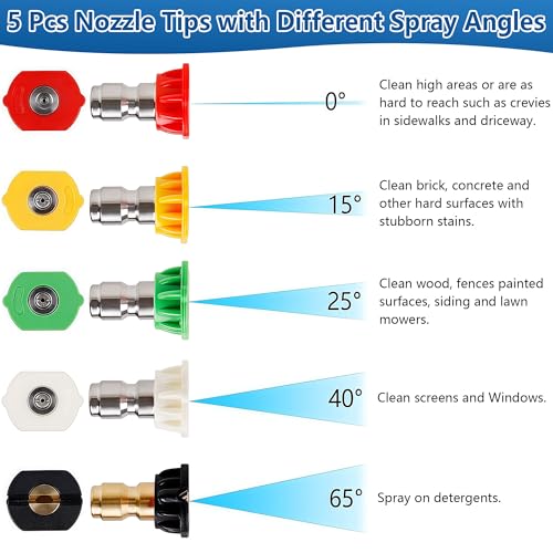 - 5 Nozzles with Different Spray Angles: 0°,15°,25°,40°,65°; Different spraying angles are suitable for different cleaning objects and cleaning needs; You can replace the nozzle according to your needs