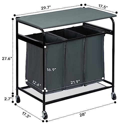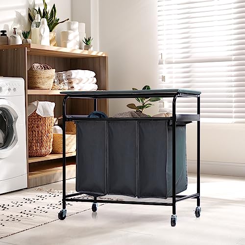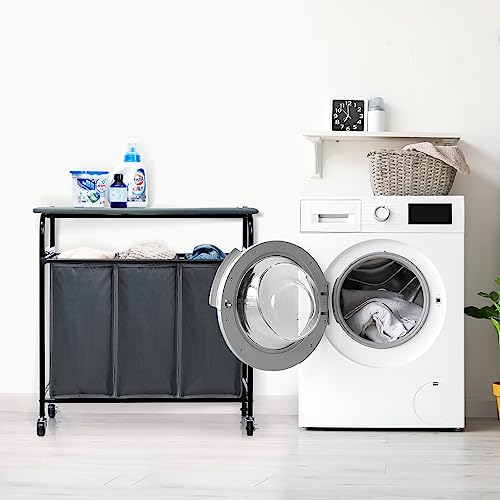 ALIMORDEN 3 laundry basket sorter with foldable ironing board,Side Pull 3 laundry basket sorter with wheels Dark Grey