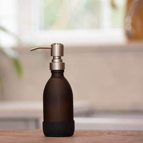 • SMOKED AMBER GLASS: With a choice of soap pump finishes (matte black, shimmering rose gold or silver steel) and sizes (250ml or 500ml) our stunning amber glass silver soap dispensers looks incredible in kitchens and bathrooms