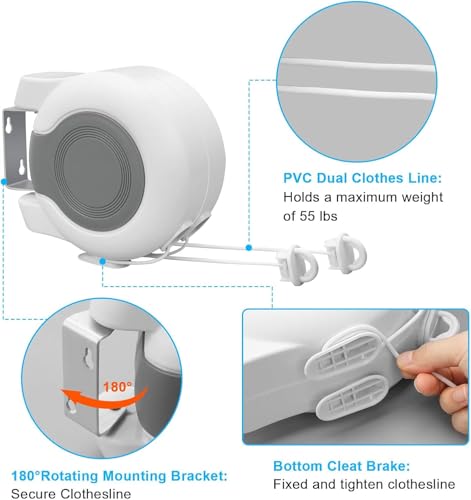 • RETRACTABLE DESIGN: Double-line retractable washing line with durable plastic housing and mounting brackets for easy installation.