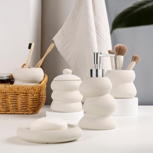 ANTIS'S HOME Ceramic Bathroom Accessories Set 5PCS – Beige Irregular Shape Small Bathroom Set, Minimalist Countertop Vanity Decor for Home, Apartment & Modern Bathroom