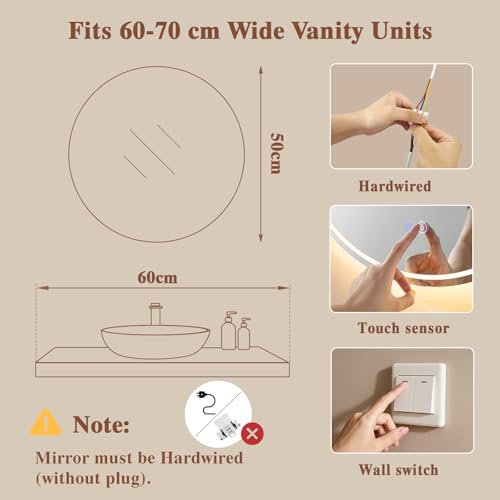 Archaluxe 500mm Round-Bathroom-Mirror-with-LED-Lights,Illuminated Wall Mounted Smart Mirror with Anti-Fog,Touch Sensor, 3 Colors Dimmable, Memory Function IP44 LED-Bathroom-Mirror