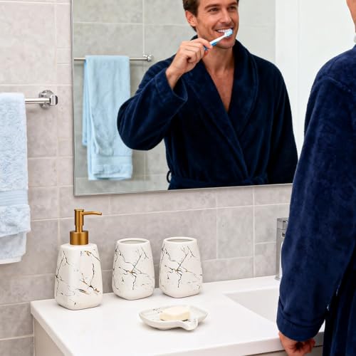 Bathroom Accessories Set, 4 Pcs Ceramic Bath Accessory Set Luxury Marble 2Pcs Toothbrush Holder/Tumbler + Liquid Soap or Lotion Dispenser Dish Creative Bath Set Modern Bathroom Decor (White)