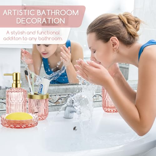 Bathroom Accessories Set, 5PCS Glass Bath Decor Set, Includes Soap Dispenser, Soap Dish, Toothbrush Holder, Tumbler and Jar, Vintage Gift (Pink)