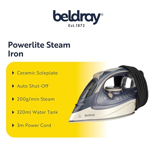 Beldray Powerlite Steam Iron, Ceramic Soleplate, Auto Shut-Off, 200g/min Steam, 320ml Water Tank, 3m Power Cord, Preheat & Ready Indicator Lights, Variable Temperature Control, Titanium, BEL01621F