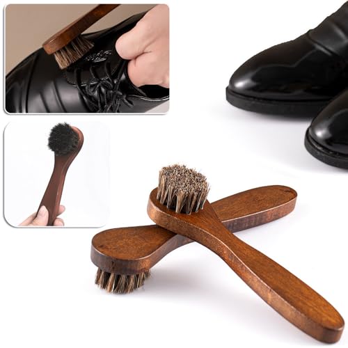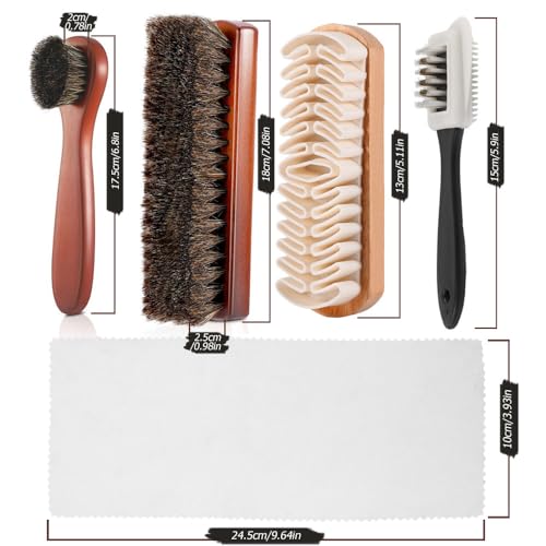 - Package & Size – The shoe brush set includes 2 horsehair shoe brushes, 1 4-sided cleaning brush, 1 suede brush and a cleaning towel. The large horsehair shoe brush is 17 x 5.5 x 4.5cm with 3cm bristles and small one is 17.5 x 4 x 3.5cm with 2cm bristles, cleaning towel is 24.5 x 10cm, suede brush is 4.3 x 13cm and 4-sided brush 15 x 4cm.