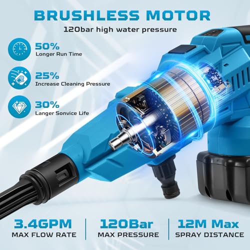 - Experience unparalleled cleaning efficiency: the portable, battery-operated pressure washer is equipped with a highly efficient brushless motor that easily achieves a powerful water pressure of 120 bar and a high flow rate of 3.4 GPM. Whether stubborn grease, mud or hard-to-reach corners, the 12 meter beam distance allows you to get the job done with ease. No need for cumbersome power cords, the high-performance motor drive makes cleaning easy, efficient and fast.