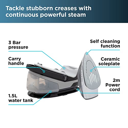 - 3 BAR PRESSURE STEAM STATION: Adds moisture to fabrics to make removing creases and crinkles effortless, with fast heat up in less than 60 seconds for quick and easy steaming