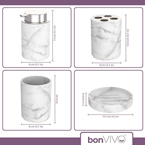 - VERSATILE: The bonVIVO Bathroom Accessory Set includes four essential pieces: a vintage soap dish with a non-slip base, a refillable soap dispenser pump, a toothbrush tumbler, and a toothbrush holder for up to 4 toothbrushes. This comprehensive bathroom accessory set is perfect for families, children, or anyone looking to organize their bathroom efficiently.