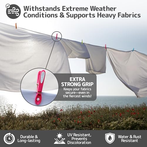 - WEATHER AND UV-RESISTANT COATING: These clips for clothes are coated with a weather and UV-resistant finish to protect against rust and corrosion. Ideal for outdoor use, ensuring this storm pegs remain in top condition even in challenging weather conditions. Our washing pegs are stronger than hurricanes and UV rays! Not only the clothes, but you are also secured that the wind will not blow them away!