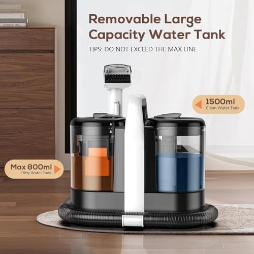 - [Efficient Dual Water Tanks]: Our carpet cleaner has a 1500ml clean water tank and a 700ml dirty water tank. This dual tank system reduces the frequency of refilling and emptying, enabling you to clean several rooms continuously