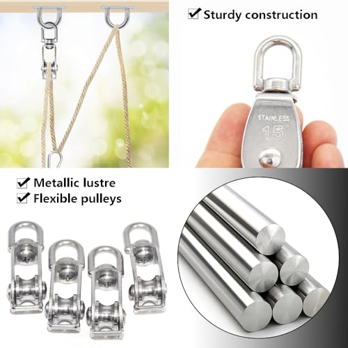 CEEYSEE 4Pcs M15 Pulley 304 Stainless Steel Pulley Single Pulley Set Heavy Duty Pulley Drum for Ropes Camping Gym Wheel Hanger Out Door Pulley Load Capacity 35kg(U/M15)