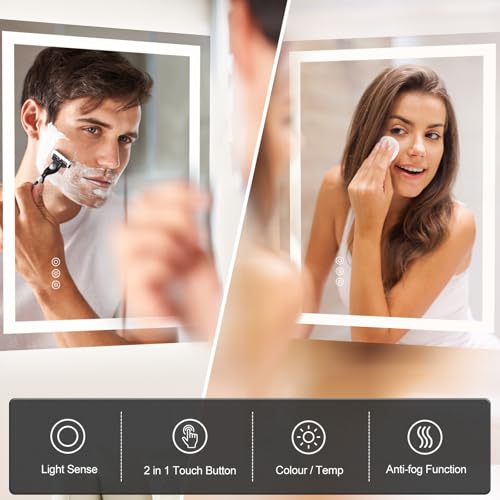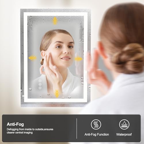 - [Safe & Efficient Defogging]The upgraded defogging system quickly heats up the entire mirror, keeping your reflection clear even in steamy environments. The anti-fog function automatically turns off after one hour to prevent overheating and conserve energy. IP44 waterproofing ensures safe use in wet bathroom conditions.