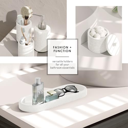 - White Bathroom Set: Includes soap dispenser, toothbrush holder, tumbler, apothecary jar with lid for cotton balls or qtip holder, and vanity tray.