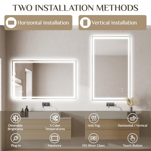 - 【Stylish Design & Flexible Installation】This lighted bathroom mirror includes clear installation instructions and all mounting hardware and can be mounted horizontally or vertically. The V-shaped bracket makes installation simple, meeting your various needs. Its modern, minimalist design makes it a perfect fit for any bathroom, guest toilet, or dressing room.