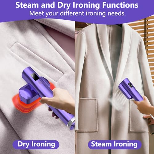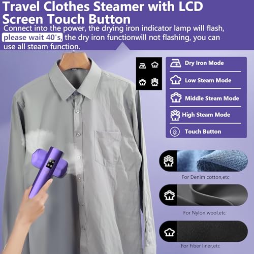 Clothes Steamer Travel Iron with LCD Screen Touch Button, 3S Fast Heat-up, 2-in-1 1200W Steamer Clothing and Steam Iron with 90° Rotatable Handle, 3 Steam Levels for Travel, Home, Office (Purple)