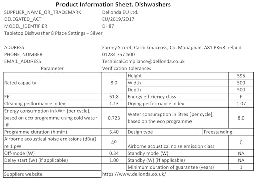 - Dimensions (W x D x H): 550 x 500 x 595mm. Energy Class F. Uses less water than washing up at only 8L/cycle! The waste pipe can be plumbed in or just directed toward the plug drain. Waste Pipe Length: 1700mm