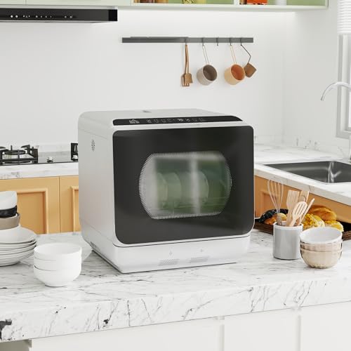 HOMCOM Table Top Dishwasher, Mini Countertop Dishwasher No Plumbing with Built-in 6L Water Tank, 6 Programs, Touch Control, LED Display, 4 Place Settings, Dual Water Supply and Fruit Wash, Silver Tone