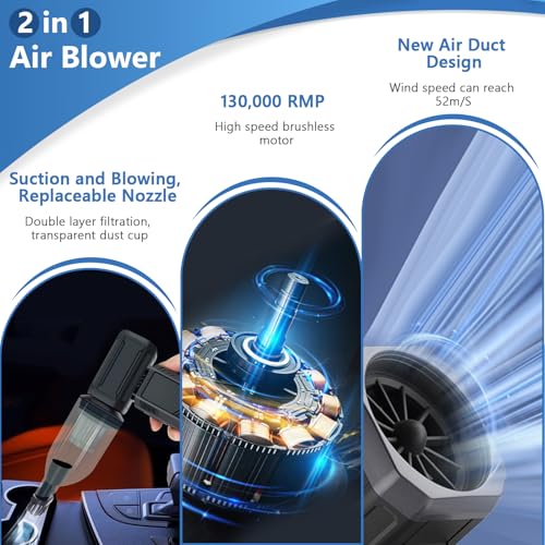 - 2 in 1 Vacuum Cleaner & Air Blower: Duster adopts integrated blowing and suction design, a variety of replaceable air nozzles, which can be used for vacuuming or blowing. Air duster is suitable for outdoor blowing, tent inflation, air cushion inflation, blowing, dust cleaning, hair drying, and vacuuming.