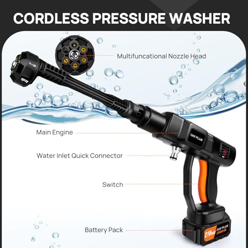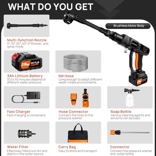 - Powerful 21V Battery:he Portable Pressure Washer comes with two high-performance 3.0 Ah batteries for long-lasting power and reliable performance. The pressure washer can be used for up to 45 minutes on a single charge, and double that time with two batteries. Ideal for DIY enthusiasts and professionals alike, this pressure washer is a smart investment that allows you to get more cleaning done in less time.