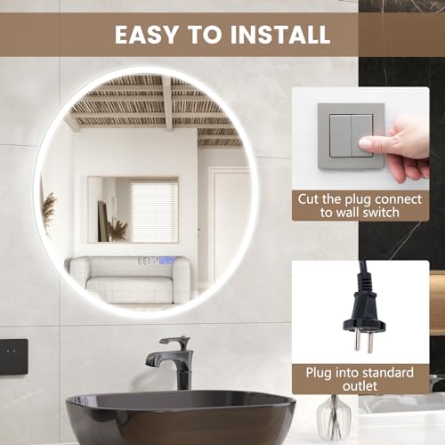 - 【2-Way Connection Required】The round bathroom mirror is built with 2 hanging hooks and the package includes necessary accessories, which makes it easy for wall mounting. Plus, this smart mirror is available in 2 connection options: choose between plug-in (power cord length 90cm/80cm) or hardwired (use the wall switch) installation to suit your preferences and electrical setup.