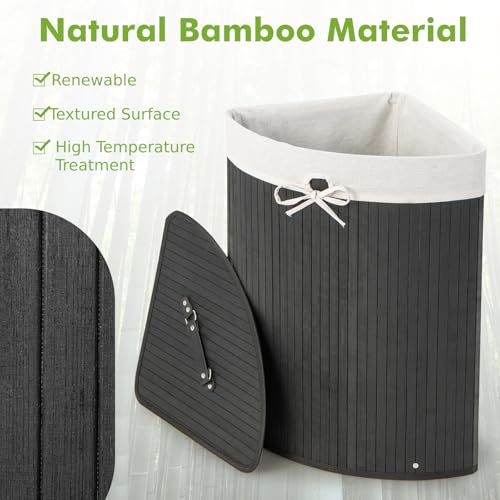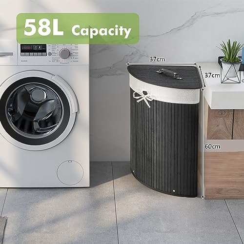 COSTWAY Bamboo Laundry Basket, 58L Corner Laundry Hamper with Lid, Handle and Removable Washable Liner Bag, Bathroom Triangle Foldable Dirty Clothes Storage Bin Washing Basket, 37x37x60cm (Black)