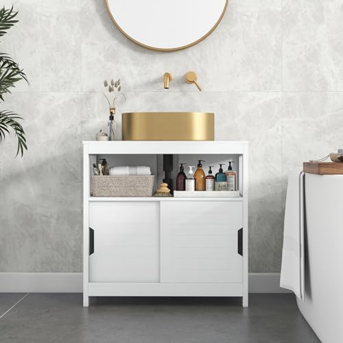COSTWAY Under Sink Cabinet, Freestanding Bathroom Floor Cabinet with Double Sliding Doors and Open Shelf, Wooden Bathroom Unit Under Basin Storage Cupboard for Toilet, 60x30x60cm, White