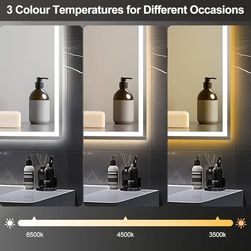 - 3 Lighting Modes & Stepless Dimming – This LED bathroom mirror offers Warm (3500K), Neutral (4500K), and Cool White (6500K) light. Long-press the touch sensor to adjust brightness (10%-100%)—perfect for shaving, or relaxing baths