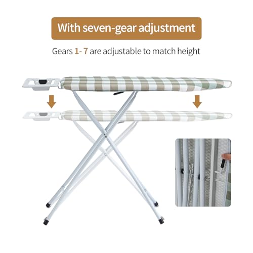 [Versatile Height & Robust Stability]Premium adjustable ironing boards feature 1-7 height settings (67-89cm) . Engineered with heavy-duty T-legs (20-30mm thickness) and non-slip protective caps, they ensure wobble-free use while protecting floors. Secure slot locks and child safety mechanisms prevent accidental adjustments.Please confirm the size before purchasing