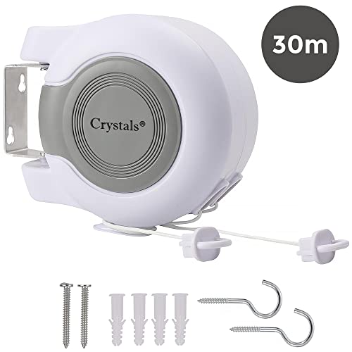 Crystals Retractable Washing Line (30 metre) Reel Clothes Lines with Twin Cable (2 x 15m) Lines of Drying Space -Extendable Wall Mounted Twin Cable Washing Line Clothes Dryer