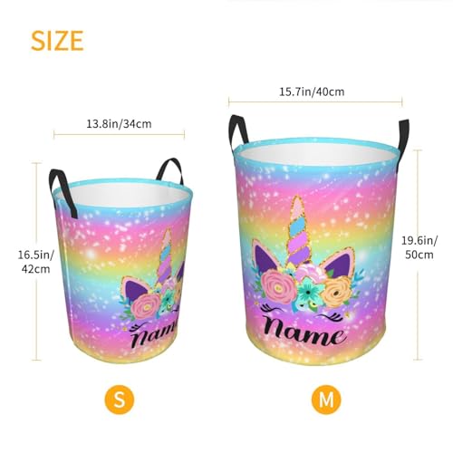 Custom Baby Unicorn Laundry Basket with Name Personalised Kids Dirty Clothes Hamper Canvas Customise Waterproof Round Storage Basket With Handles for Bedroom Bathroom Girls Boys Gifts Small