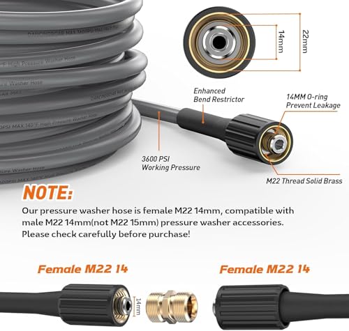 - 【Compatibility】- The jet wash hose can withstand up to 3600PSI pressure, the female M22 14 power washer extension hose suits for most household and commercial pressure washers on the market. The attached dual Male M22 14mm thread adapter is for connecting two high pressure hoses, expanding the radius of use.