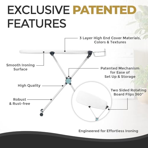 - Space-Saving Fold: The adjustable ironing board flat with an easy-lock mechanism for compact storage. When folded, it can also stand on its own, so you can tuck it into a closet or corner when not in use.