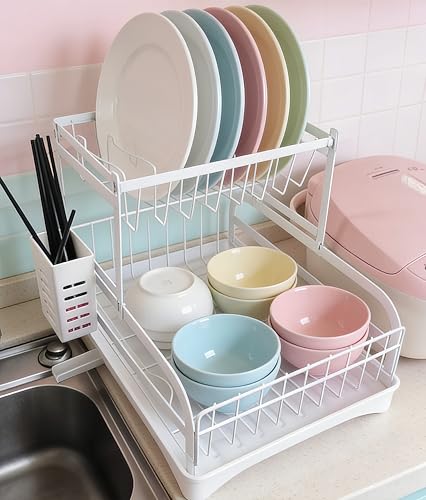 Uwenkjie dish drainer rack,2 tier dish drainer rack,dish racks with drain board,Kitchen Dish Drain Stand, Stainless Steel Sink Dish Stand with Utensils and Cutting Board Rack,white