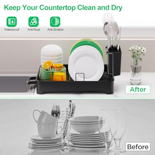 - Space-Saving Size and Large Capacity: The black dish drainer with cutlery drainer measures only 15.7''L x 12''W x 7"H. Our dish rack drainer fits perfectly for a tiny efficiency kitchen and big enough for holding 10 plates and other kitchenware