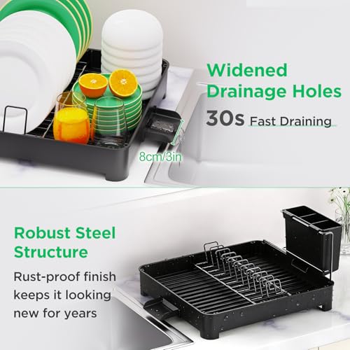 Beizkna Dish Drainer Rack Stainless Steel Dish Drying Rack Kitchen with Drip Tray Space-Saving Draining Board Rack for Counter Sink with Cutlery Holder for Utensil Washing Up, Black 15.7''L x 12''W