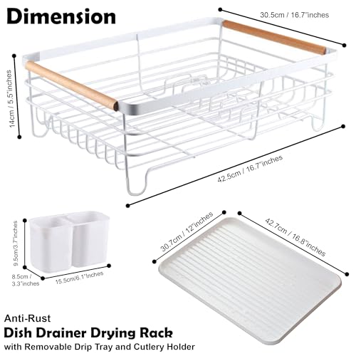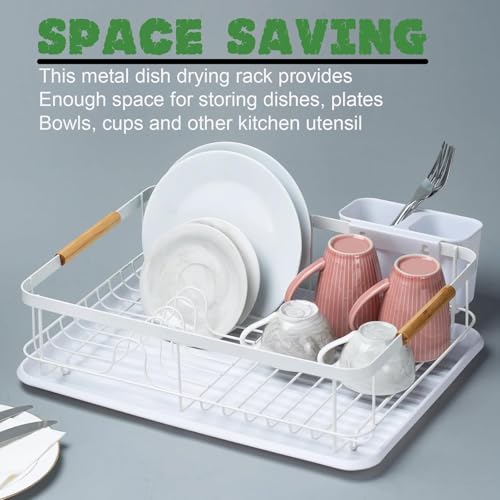 Dish rack drainer, Anti-Rust White metal dish drainer rack with dip Tray, Separate Cutlery Holder, White and wood dish drainer Wooden Handles Dish Drying Rak for kitchen Countertop Easy Clean Assembly
