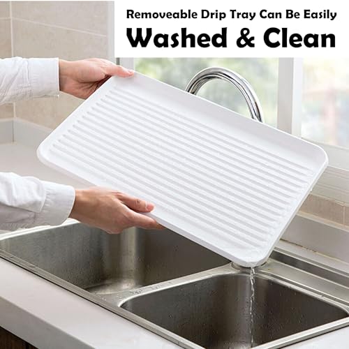 - Clean & Fast Drying: The dish rack drainer metal dish drying rack drainer includes a drip tray to capture all drained water and is easy to wipe down and keep clean. Our dish drainer provides quick drainage and quick drying. The cutlery holder neatly fits onto the side of the dish drainer for quick drying of cutlery.