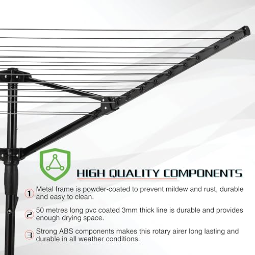 - 【High-Quality Materials】The 4 arms and heavy-duty poles are powder-coated to prevent mildew and rust and easy to clean. 45M of a fully weatherproof and UV-resistant washing line with non-slip function, can hold up to 18kg. It is enough for a family use.